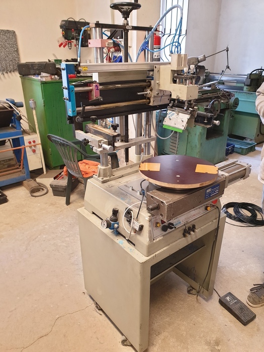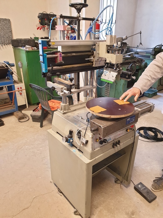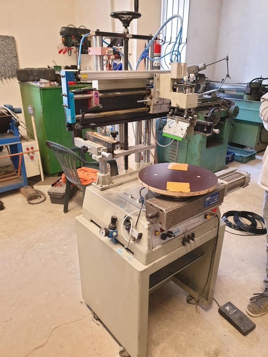 Příklad modernizace potiskovacího stroje, kde se díky změně způsobu potisku, podařilo zvýšit v násobcích počty vyrobených kusů a tím došlo k výraznému zkrácení dodacích termínů a samozřejmě k celkovému snížení pracnosti. Původně se tisknul každý obvod zvlášť. Díky otočnému karuselu lze postupně vkládat celkem čtyři polovodičové obvody. Během jednoho otočení karuselu dojde k potisku, vysušení i vyhození obvodu z držáku karuselu. Viz. foto níže